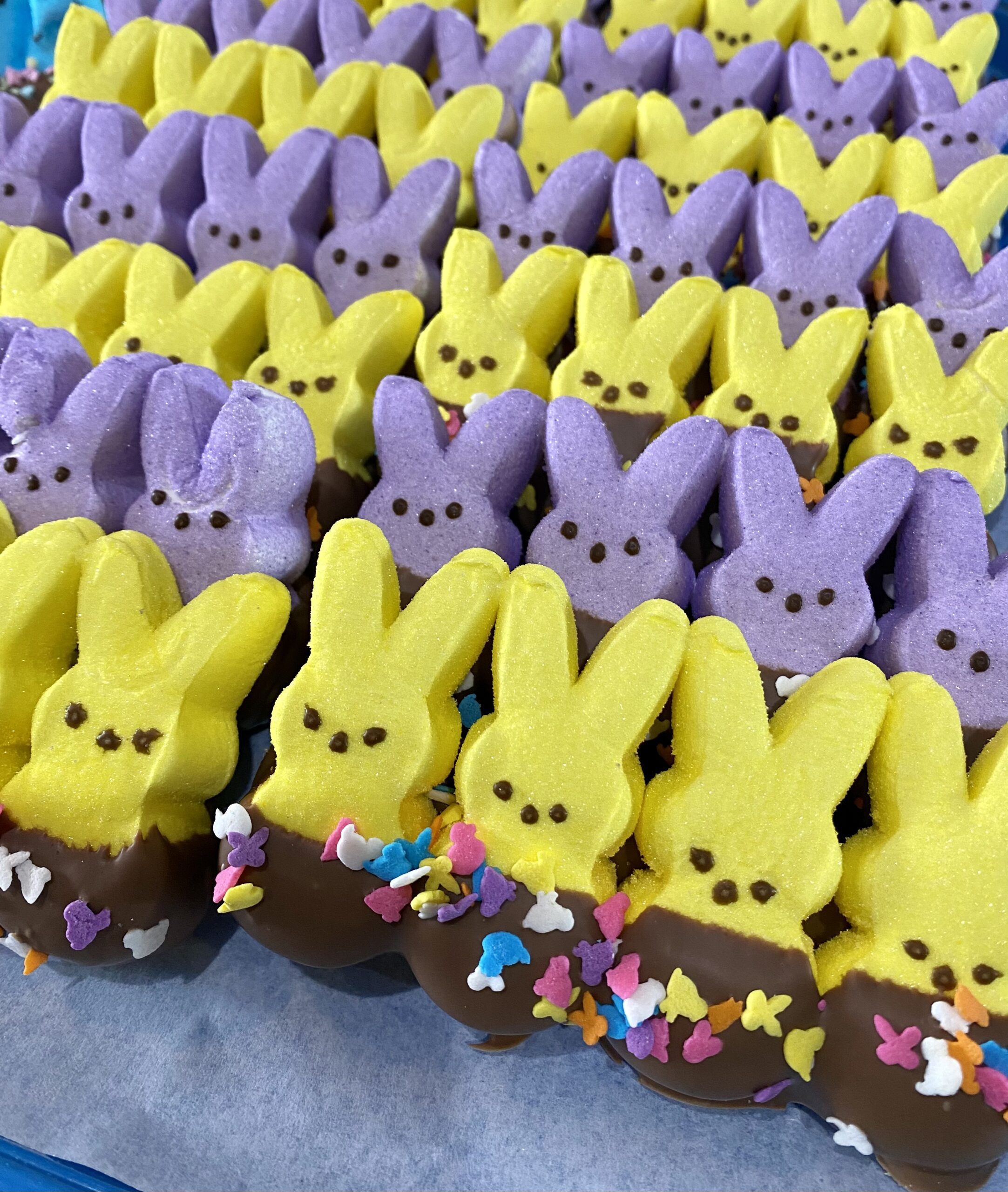 Peeps brand marshmallow bunny’s and chicks dipped in milk chocolate. This combination is sure to satisfy any sweet tooth. One row, set of four bunnies or five chicks dipped.